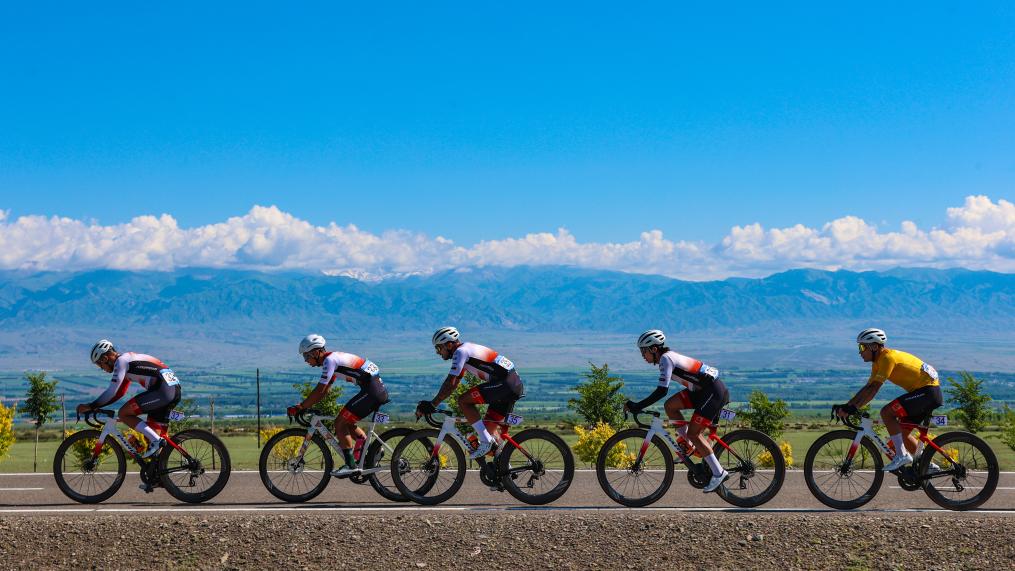 5月30日,第十六屆環(huán)賽里木湖賽第三賽段比賽中,運(yùn)動員正在騎行。新華社發(fā)(于蘇甫·艾尼 攝)