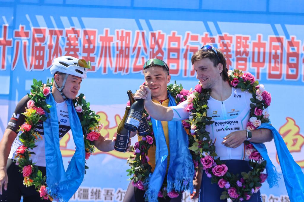 5月30日,第十六屆環(huán)賽里木湖賽第三賽段比賽結(jié)束后,尼古拉斯·馬利尼(右1)與其他獲獎選手慶祝勝利。新華社發(fā)(于蘇甫·艾尼 攝)