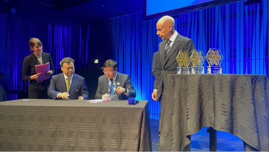 會(huì)上,國際雪聯(lián)主席約翰·埃利亞施、秘書長米歇爾·韋恩與國家體育總局冬季運(yùn)動(dòng)管理中心主任王磊、張家口市人民政府副市長劉海峰簽訂了辦賽協(xié)議。埃利亞施向張家口市頒發(fā)2029年國際雪聯(lián)單板滑雪和自由式滑雪世錦賽舉辦城市牌匾,王磊、河北省體育局局長王彪、劉海峰共同接牌。