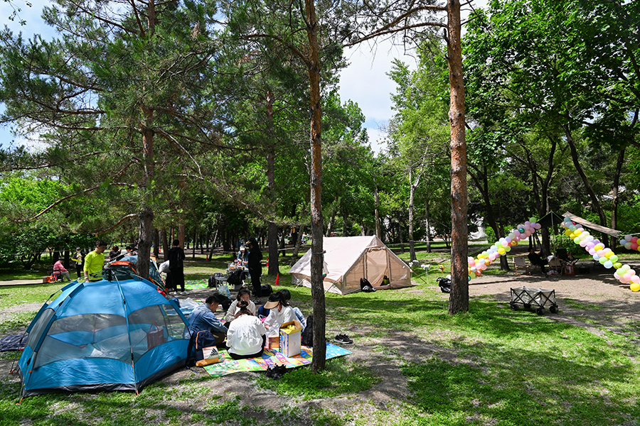 圖為6月4日拍攝的游人在太陽(yáng)島風(fēng)景區(qū)的露營(yíng)區(qū)體驗(yàn)游玩。新華社發(fā)