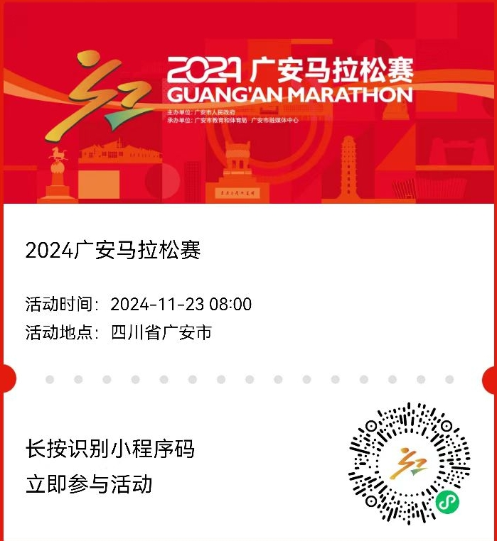 2024廣安馬拉松由中國田徑協(xié)會(huì)認(rèn)證,廣安市人民政府主辦。賽事以“共富思源 奔跑廣安”為主題,規(guī)模20000人,共設(shè)置馬拉松(42.195公里)、半程馬拉松(21.0975公里)及歡樂跑(5公里)三個(gè)競賽項(xiàng)目。其中,馬拉松項(xiàng)目限報(bào)3000人,半程馬拉松項(xiàng)目限報(bào)7000人,歡樂跑項(xiàng)目限報(bào)10000人,各項(xiàng)目均報(bào)滿即止。本屆賽事除公開線上報(bào)名外,還將邀請(qǐng)全國媒體跑團(tuán)、企業(yè)家跑團(tuán)、知名人士跑團(tuán)、川渝高校跑團(tuán)、社會(huì)跑團(tuán)等組成跑團(tuán)方陣,為成渝地區(qū)雙城經(jīng)濟(jì)圈建設(shè)助陣。