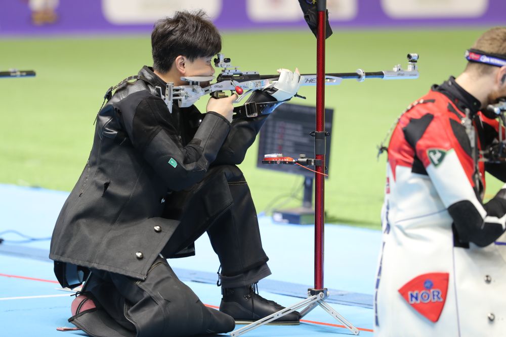 男子50米步槍三姿決賽的懸念持續(xù)到最后一槍。跪射和臥射結(jié)束后,奧運冠軍劉宇坤比排名第二的印度新秀托馬爾高出0.2環(huán)。此后,這位28歲的世界紀錄保持者始終保持著微弱領(lǐng)先。倒數(shù)第二槍,劉宇坤打出9.7環(huán),被托馬爾反超0.1環(huán)。最后一槍,劉宇坤10.1環(huán),而對手經(jīng)過長時間猶豫打出9.8環(huán),葬送良機。劉宇坤以0.2環(huán)的優(yōu)勢驚險奪冠,成績?yōu)?67.1環(huán)。這也是劉宇坤的第一個世錦賽冠軍,他曾在2017年世錦賽中獲得該項目青年組冠軍。