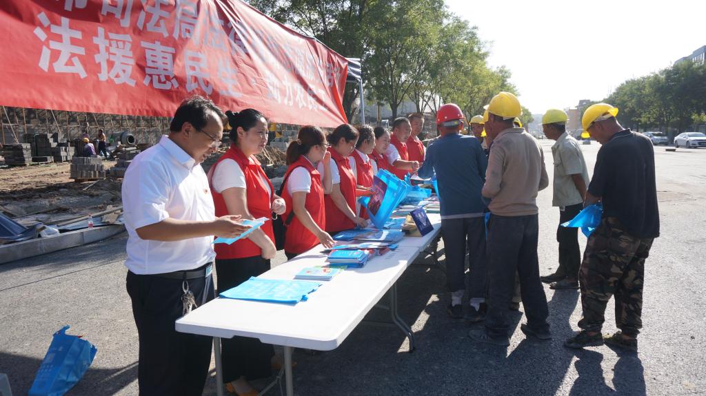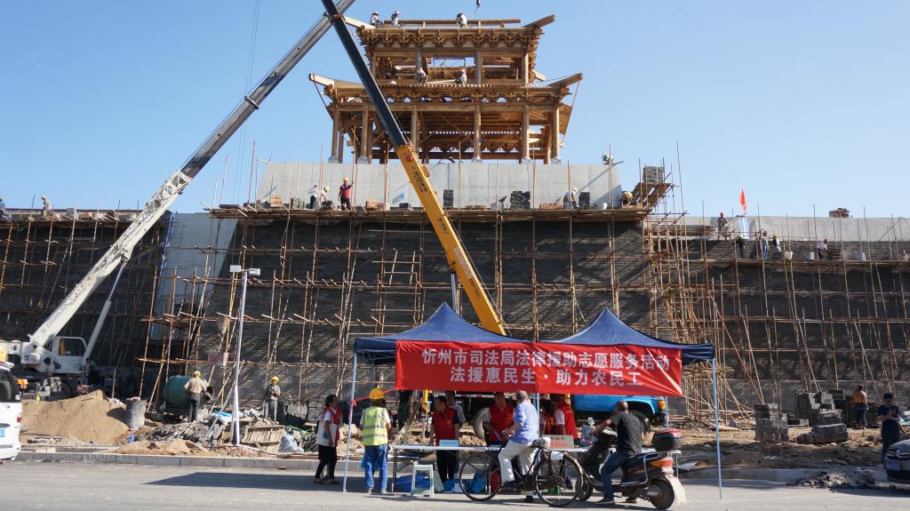 為深入貫徹落實習(xí)近平新時代中國特色社會主義思想和黨的十九大及十九屆二中、三中、四中全會精神,貫徹落實《保障農(nóng)民工工資支付條例》和國家、山西省關(guān)于農(nóng)民工服務(wù)工作的部署,切實加強我市農(nóng)民工安全生產(chǎn)意識,提高農(nóng)民工的維權(quán)意識和維權(quán)能力,8月13日下午,忻州市司法局組織市法律援助中心、公證處、律師事務(wù)所、司法鑒定中心組成法律援助志愿服務(wù)隊,走進忻州古城建筑工地現(xiàn)場,開展了“法援惠民生·助力農(nóng)民工”法律援助志愿服務(wù)活動。