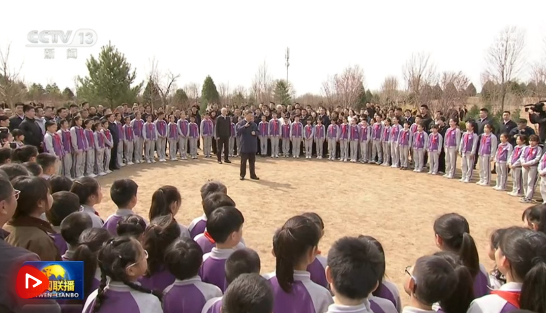 3月30日,黨和國家領(lǐng)導人習近平、李強、趙樂際、王滬寧、蔡奇、丁薛祥、李希等來到北京市昌平區(qū)百善鎮(zhèn)參加首都義務植樹活動。這是習近平同在場的干部群眾、少先隊員親切交談。