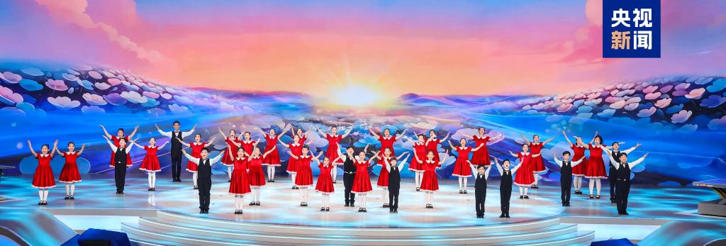 △中美“乒乓外交”55周年紀(jì)念大會(huì)上,中美青少年合唱歌曲《銀球飛舞花盛開(kāi)》。