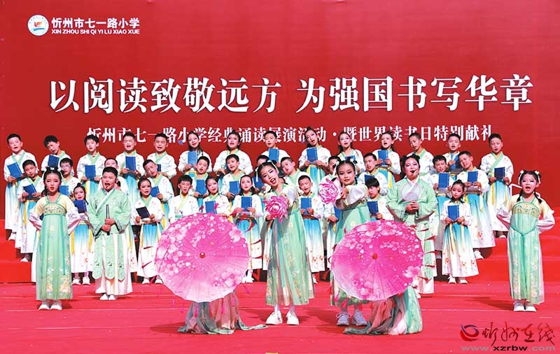 4月20日,忻州市七一路小學(xué)舉辦“以閱讀致敬遠(yuǎn)方 為強國書寫華章”經(jīng)典誦讀展演,獻(xiàn)禮世界讀書日,童聲誦經(jīng)典,書香潤校園。(記者 張存良攝)