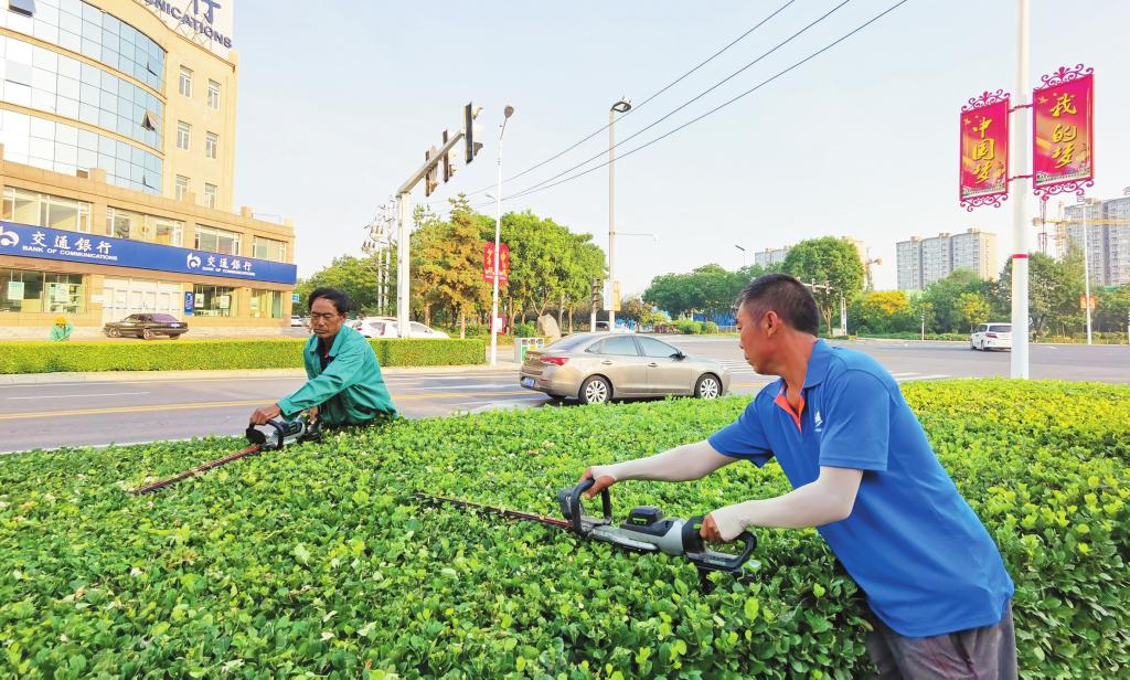 近日,我市園林部門組織人員對城區(qū)綠化帶進行了修剪。園林工人的辛勤工作為市民營造了舒適的環(huán)境。 (王國棟 攝)