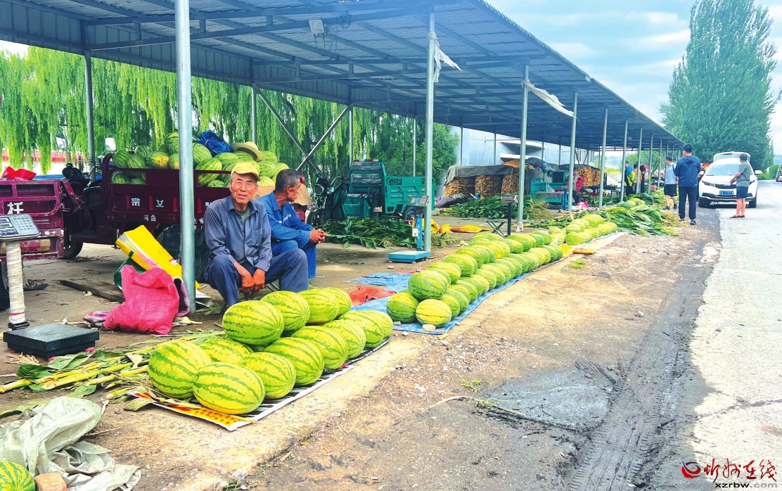 市場(chǎng)有回響,品質(zhì)過(guò)硬銷路旺。在村里的瓜果交易市場(chǎng),75歲的鄔培林?jǐn)偽磺?,一排排個(gè)頭飽滿的西瓜格外顯眼。有著多年種植經(jīng)驗(yàn)的他對(duì)市場(chǎng)行情了如指掌:“西瓜上市半個(gè)多月了,剛開(kāi)始賣兩元一斤,現(xiàn)在是6角一斤,正在陸續(xù)降價(jià)?!彪m然價(jià)格隨上市時(shí)間有所回落,但西瓜品質(zhì)好不愁銷路。