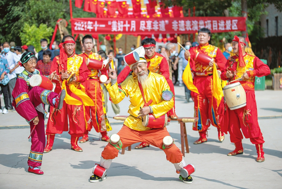 10月2日,民間藝人在鹽湖區(qū)東郭鎮(zhèn)嵐山根景區(qū)表演國(guó)家級(jí)非遺“萬榮花鼓”。國(guó)慶長(zhǎng)假期間,運(yùn)城市鹽湖區(qū)東郭鎮(zhèn)嵐山根景區(qū)在做好疫情防控的同時(shí),推出“非遺進(jìn)景區(qū)”、蒲劇展演等豐富多彩的民俗活動(dòng),吸引了眾多游客前來游玩。(閆鑫攝)