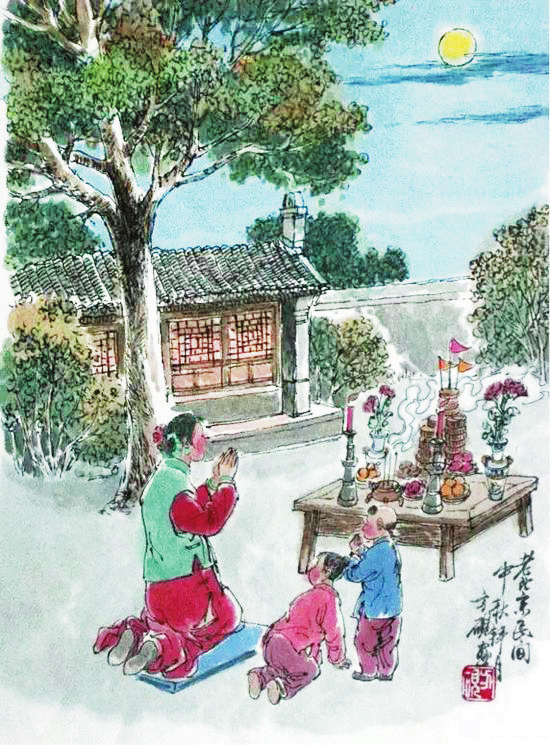 “中秋月。月到中秋偏皎潔。”賞月是中秋節(jié)的重要習(xí)俗,我國民間的中秋賞月活動約始于魏晉時(shí)期,盛于唐朝,當(dāng)時(shí)許多名篇佳作中都有詠月的詩句。北宋時(shí)期,以賞月活動為中心的中秋節(jié)已成為普遍的民俗節(jié)日,然而與唐代不同的是,宋代關(guān)于賞月的作品多是感物傷懷,以陰晴圓缺喻人情世態(tài)。宋代的中秋夜是不眠之夜,夜市通宵營業(yè),游人絡(luò)繹不絕,《東京夢華錄》中載:“中秋節(jié)前,諸店皆賣新酒,貴家結(jié)飾臺榭,民家爭占酒樓玩月,笙歌遠(yuǎn)聞千里,嬉戲連坐至?xí)??!币恍┑胤缴踔亮鱾鳌爸星镆乖酵硭介L壽”的說法,于是有了守夜的習(xí)俗。守夜時(shí),家里長輩通常會給小孩講關(guān)于月亮的故事,如嫦娥奔月、吳剛伐桂等,孩子們個(gè)個(gè)聽得津津有味。