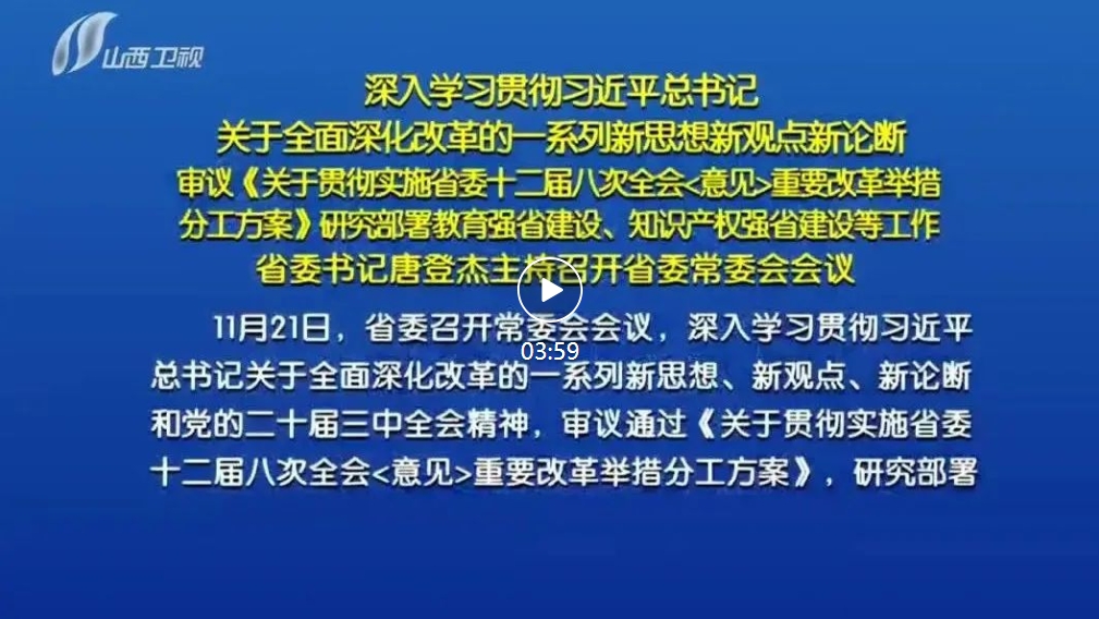山西日報報道 11月21日,省委召開常委會會議,深入學習貫徹習近平總書記關于全面深化改革的一系列新思想、新觀點、新論斷和黨的二十屆三中全會精神,審議通過《關于貫徹實施省委十二屆八次全會〈意見〉重要改革舉措分工方案》,研究部署教育強省建設、知識產(chǎn)權(quán)強省建設等工作。省委書記唐登杰主持會議并講話。