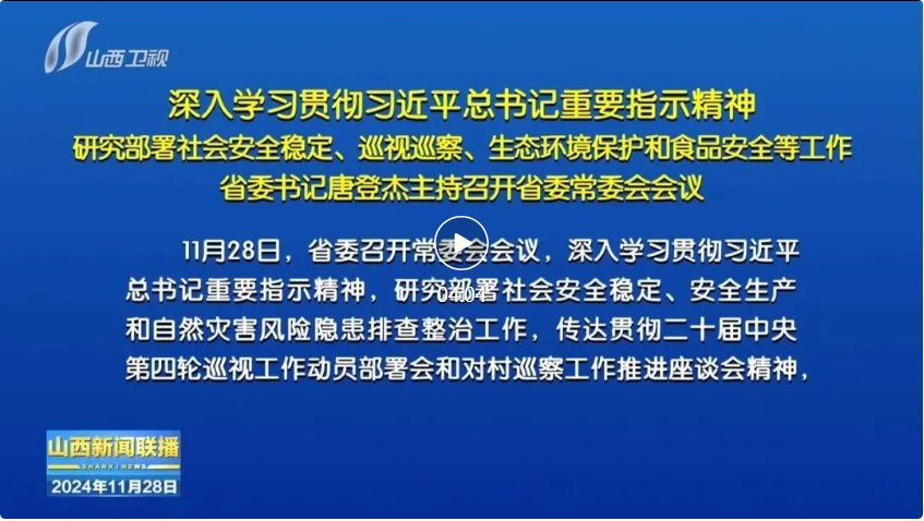 山西日?qǐng)?bào)報(bào)道 11月28日,省委召開常委會(huì)會(huì)議,深入學(xué)習(xí)貫徹習(xí)近平總書記重要指示精神,研究部署社會(huì)安全穩(wěn)定、安全生產(chǎn)和自然災(zāi)害風(fēng)險(xiǎn)隱患排查整治工作,傳達(dá)貫徹二十屆中央第四輪巡視工作動(dòng)員部署會(huì)和對(duì)村巡察工作推進(jìn)座談會(huì)精神,聽取全省打好污染防治攻堅(jiān)戰(zhàn)和加強(qiáng)食品安全監(jiān)管等情況匯報(bào)。省委書記唐登杰主持會(huì)議。