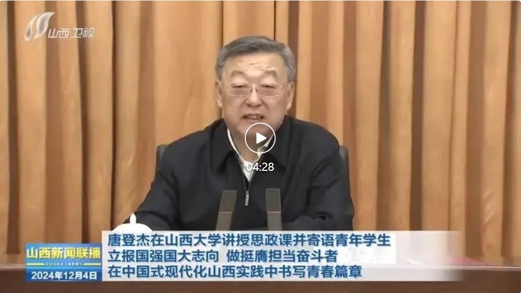 山西日?qǐng)?bào)記者陳俊琦報(bào)道 12月3日,省委書(shū)記唐登杰來(lái)到山西大學(xué)講授思政課,深入學(xué)習(xí)貫徹習(xí)近平新時(shí)代中國(guó)特色社會(huì)主義思想和黨的二十屆三中全會(huì)精神,寄語(yǔ)全省廣大青年學(xué)生牢記領(lǐng)袖殷殷囑托,立報(bào)國(guó)強(qiáng)國(guó)大志向、做挺膺擔(dān)當(dāng)奮斗者,在中國(guó)式現(xiàn)代化山西實(shí)踐中書(shū)寫(xiě)青春篇章。省委常委、秘書(shū)長(zhǎng)李鳳岐參加。