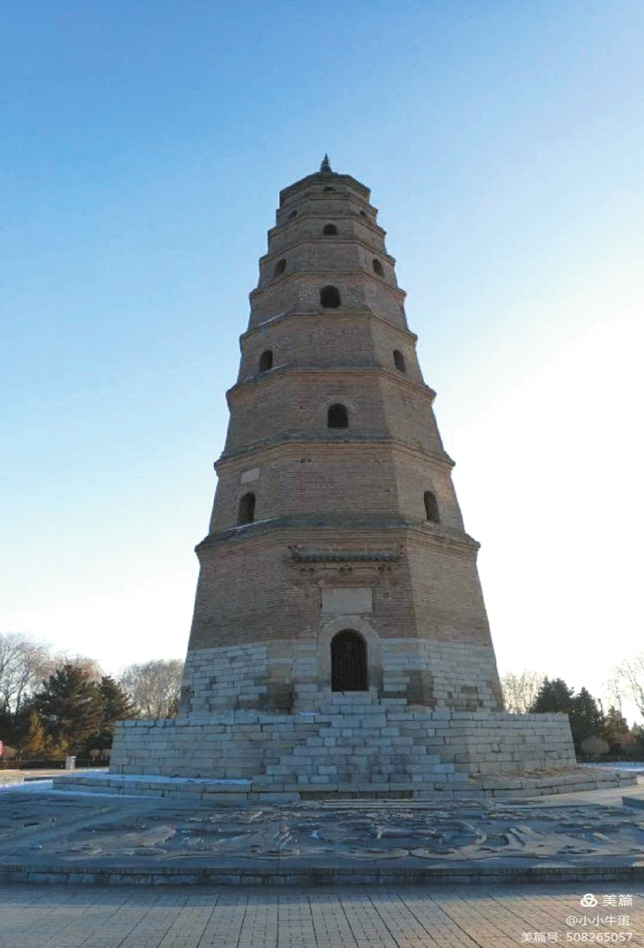 偏關縣城東山上的文筆塔,又稱“文筆凌霄塔”,是一座保存完好的空心磚塔。始建于明朝天啟元年(1621),原為一座七層磚石結(jié)構八角雁塔。崇禎八年(1635)加高四層,共十一層,上書“文筆凌霄”字樣。塔高35米,塔底周長29米。清代咸豐七年(1857)文筆凌霄塔因風雨侵蝕嚴重。新中國建立以后,偏關人民又重修寶塔。
