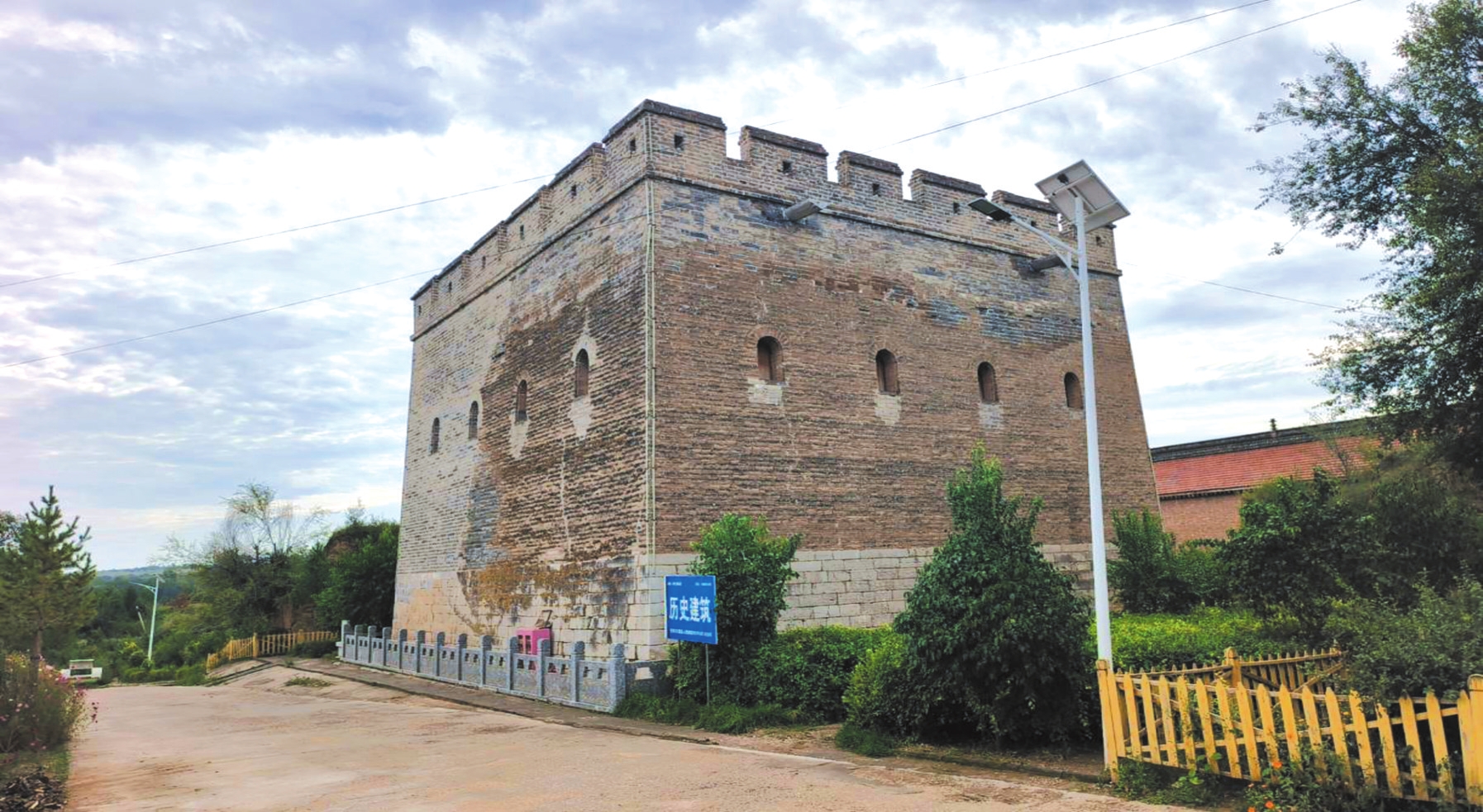 郭家河靖邊樓位于五寨縣東秀莊鄉(xiāng)郭家河村。據(jù)縣志考證,此樓建于明代萬(wàn)歷年間,坐北朝南,平面呈正方形,邊長(zhǎng)約16米,占地面積約259平方米。通高11米,頂部設(shè)垛口,內(nèi)部形制為環(huán)形,磚砌拱券,四面布箭窗。靖邊樓南面正中為拱券石門,門額鑲嵌石匾,四周雕刻云勾紋,上刻楷書“靖邊樓”,下刻落款“山西路管轄太原……岢嵐?fàn)I守部指揮趙恭”等字樣。靖邊樓堡墻長(zhǎng)約1600米,基寬3至6米,殘高5至7米,夯層厚度10至15厘米。靖邊樓作為明代保境安民的邊塞防御體系,對(duì)明代中期邊防軍事部署研究具有重要作用,具有較高的歷史價(jià)值、藝術(shù)價(jià)值和科學(xué)價(jià)值。