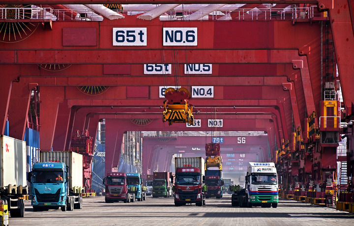 2024年2月11日,卡車(chē)在青島港集裝箱碼頭裝運(yùn)集裝箱。新華社記者 李紫恒 攝