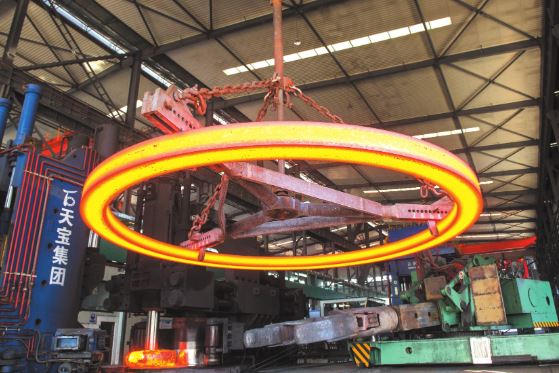 在定襄天寶集團的法蘭制造車間,大型法蘭新鮮出爐。本報記者范琛攝